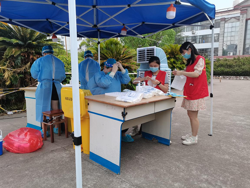 17日下午5時許,海森藥業(yè)5名黨員志愿者們穿上紅馬甲,戴好口罩,在東陽經(jīng)濟開發(fā)區(qū)原俞氏服飾廠區(qū)核酸采樣點開始了核酸檢測志愿服務(wù)。